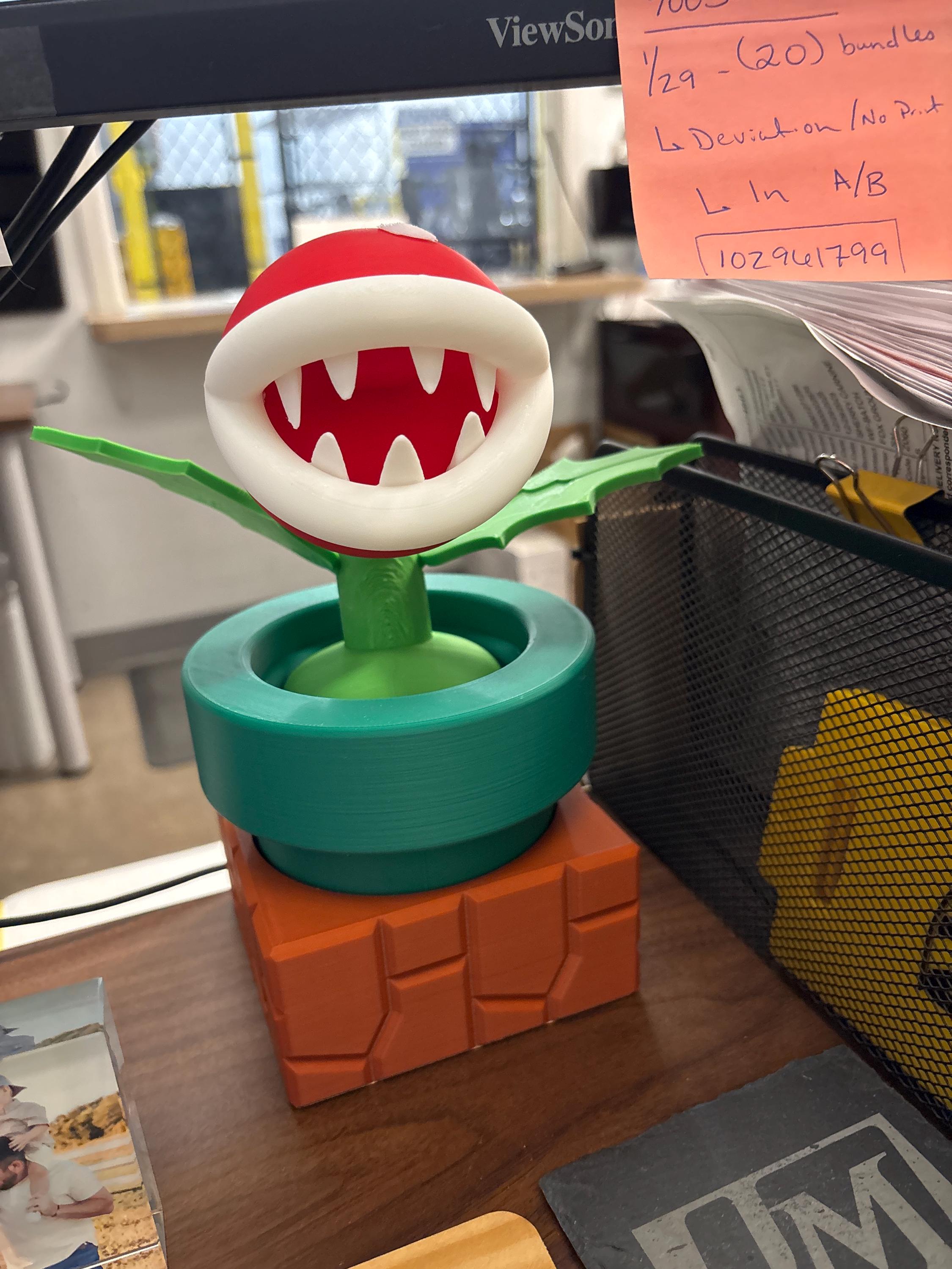 Straight from the pipes of the Mushroom Kingdom, this 3D printed Piranha Plant is ready to chomp its way onto your game shelf! With vibrant character and optional brick base, this display piece is the perfect addition for any Nintendo fan, cosplay setup, or gamer room.